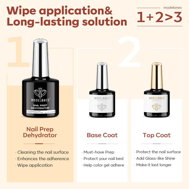 - 🌟【Nail tech must haves for nail art】: The package includes 1*10ml gel base coat + 1*10ml glossy top coat + 1*10ml nail prep dehydrator. Using this Nail Starter Kit can extend the effect of nail products, and keep your nail art long-lasting for over 28 days.