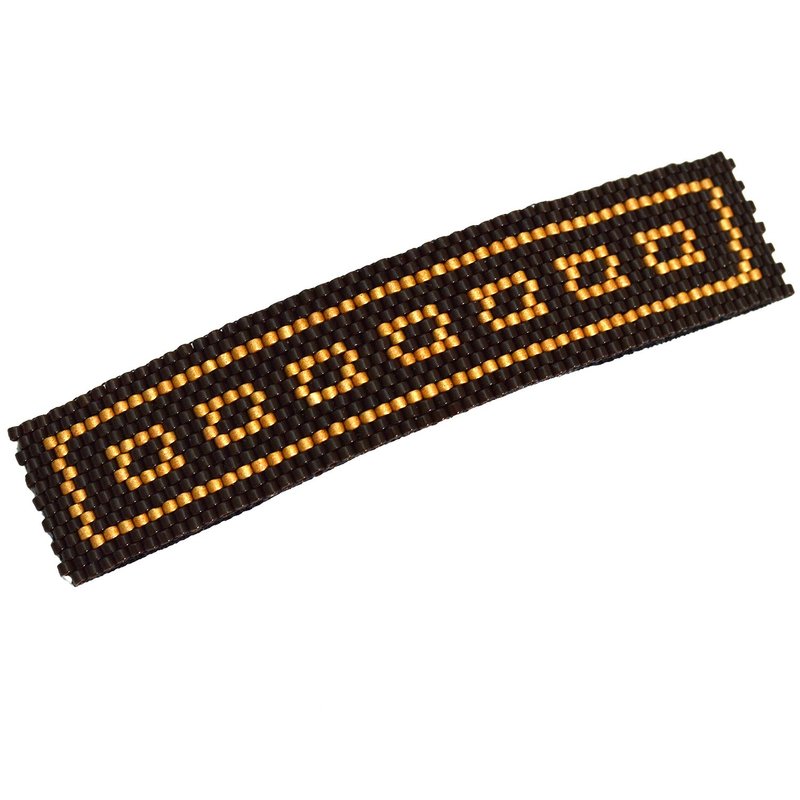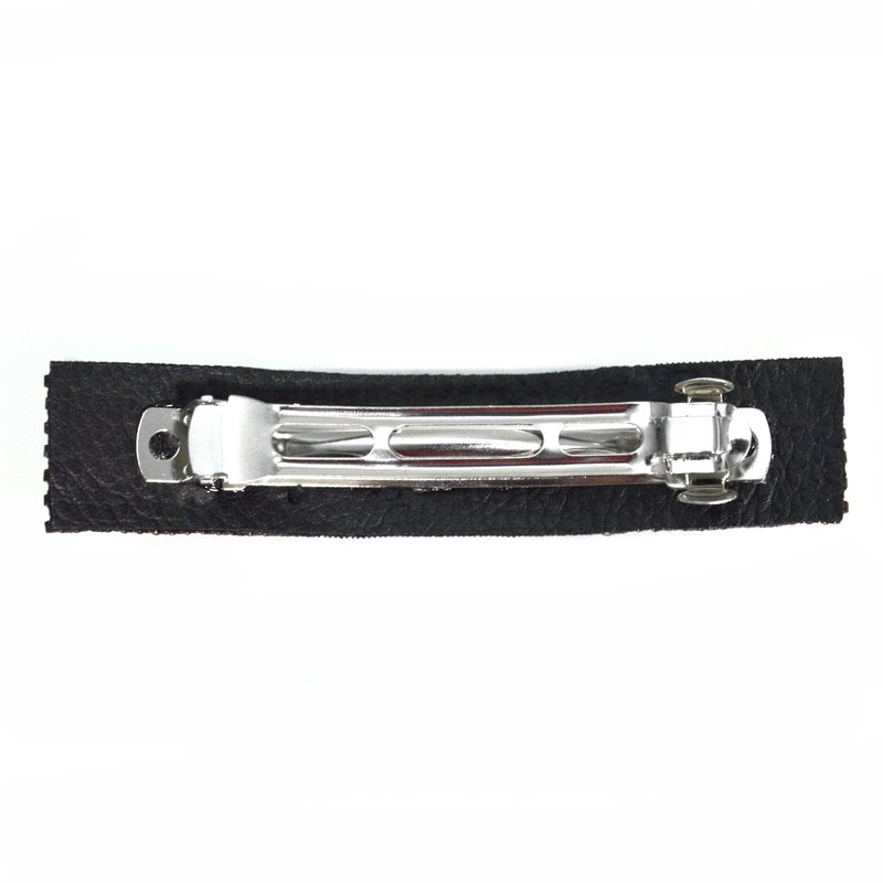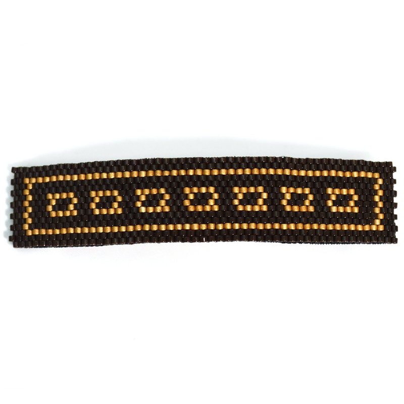 This brown and bronze colored barrette hair clip is the perfect addition to your modern fashion ensemble. This beaded barrette clip slips in your locks easily and hold itself in place with a single snap. Simple, modern design in sparkling silver and solid black beads pairs effortlessly with your current wardrobe. This geometric, beaded barrette design measures 3.5 inches wide by 0.8 inches tall at it's tallest point. French metal barrette clip measures 3 inches long.