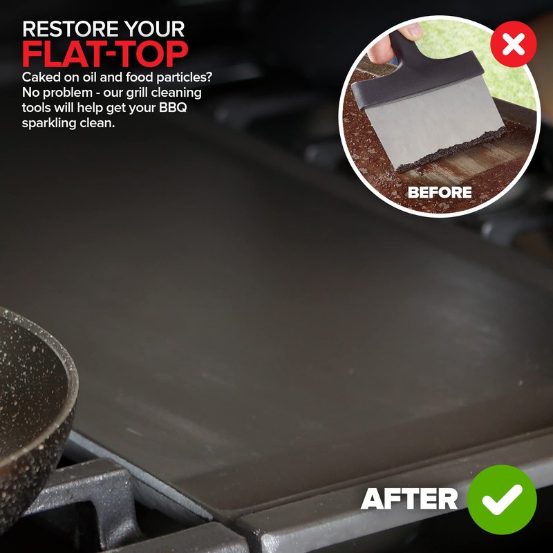 - Restore Your Flat-Top: Never use abrasive tools or harsh chemicals again! Our cleaning kit can be safely used on hot grill tops to remove even the hardest stains and grime to bring your barbecue back to all its glory.