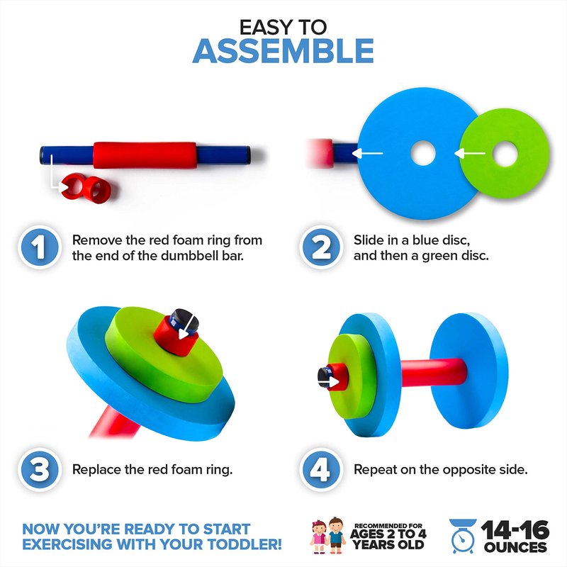 - Safe for Your Toddler: Made of PE foam, our kids dumbbells are 100% lead-free and free from hazardous materials. They're light-weight, so your child can exercise alongside you without the worry of them getting hurt. Each dumbbell is about 14-16 ounces.