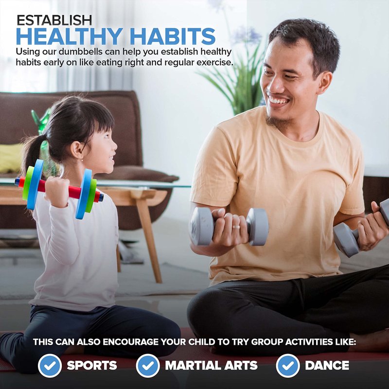 Add excersize into your toddler’s routine with our 1lb weight sets. From an early age, children learn the most through social interaction, and often, imitating their parents. Our dumbellsweights can help you integrate your workouts and personal time with baby, which is a great way to teach healthy habits. This may also encourage your kids to take on physical activities like sports, martial arts, dance, and more! Get your child more involved by having them choose different dumbbell exercises with you. Giving them choices can get them more excited about exercising. Your toddler will love to show you all the exercises they can do with their dumbells. You can also use them to complete a costume for themed parties and Halloween. Pair with our kids weight barbell to complete your fitness set!