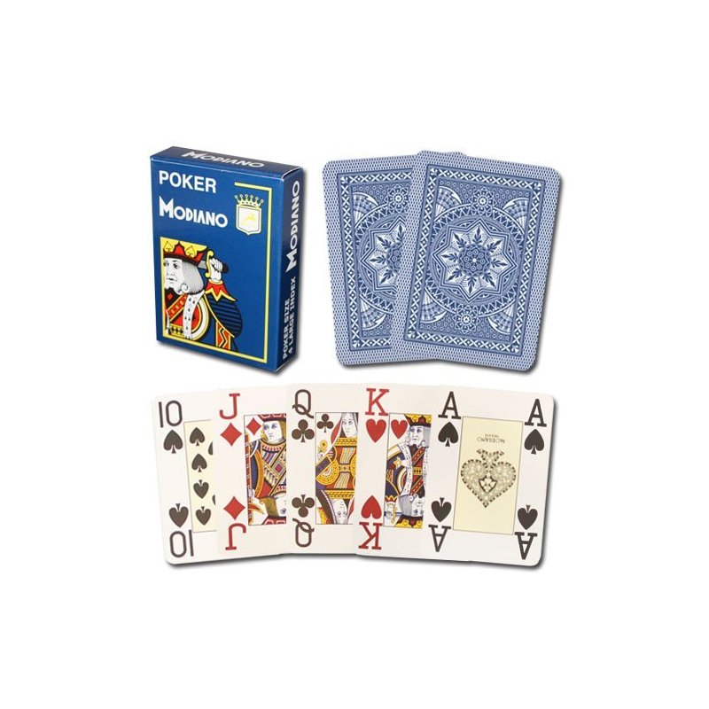 One deck Modiano Cristallo 100% Plastic Playing Cards, 4 PIP Jumbo Index. Modiano makes a powerful playing card. The card is ultra thick and very textured. The shuffle and cut feels more like traditional playing cards than any other brand. If you have ever felt a plastic card and said "this is flimsy" Modiano is the card for you. This is the unique 4 PIP Jumbo Index. 8 colors to choose from: red, orange, brown, violet, light blue, dark blue, light green and dark green.