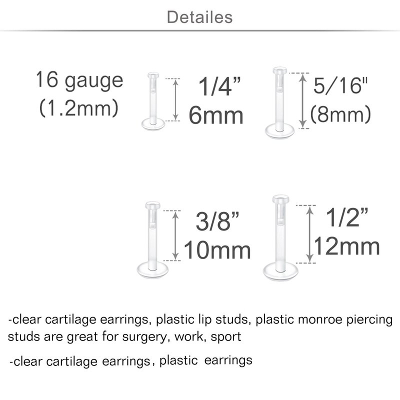 - [Measurements]: Clear earrings for work sports 16g(1.2mm); bar length : 1/4"(6mm), 5/16"(8mm), 3/8"(10mm), 1/2"(12mm); Push on clear lip rings top: 3mm;