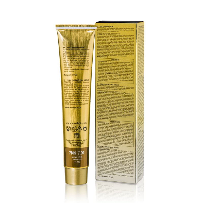 - ✔️ HOW TO USE THE COLORING CRÈME — The application is easy with the non-drip formulation. Mix 1 part of 7NN Blonde Intense color with 1 1⁄2 part of Moehair developer. Apply the permanent hair color mix on washed and dry hair, leave it on for 60 minutes, and rinse off with shampoo, followed by conditioner. For root touch-up, apply the formula on new regrowth and process for 30 minutes before rinsing off