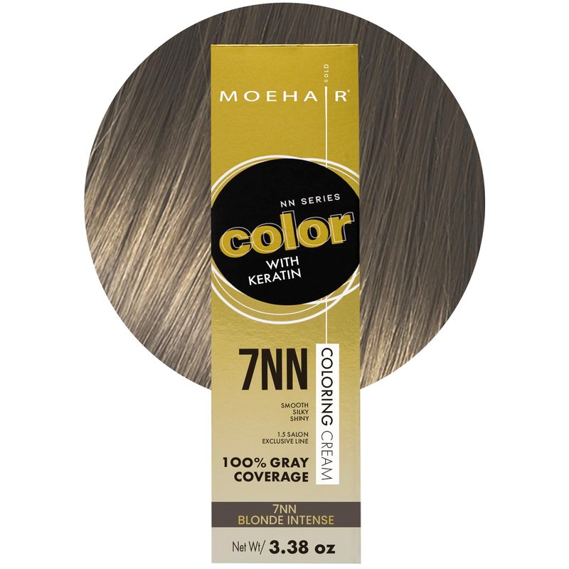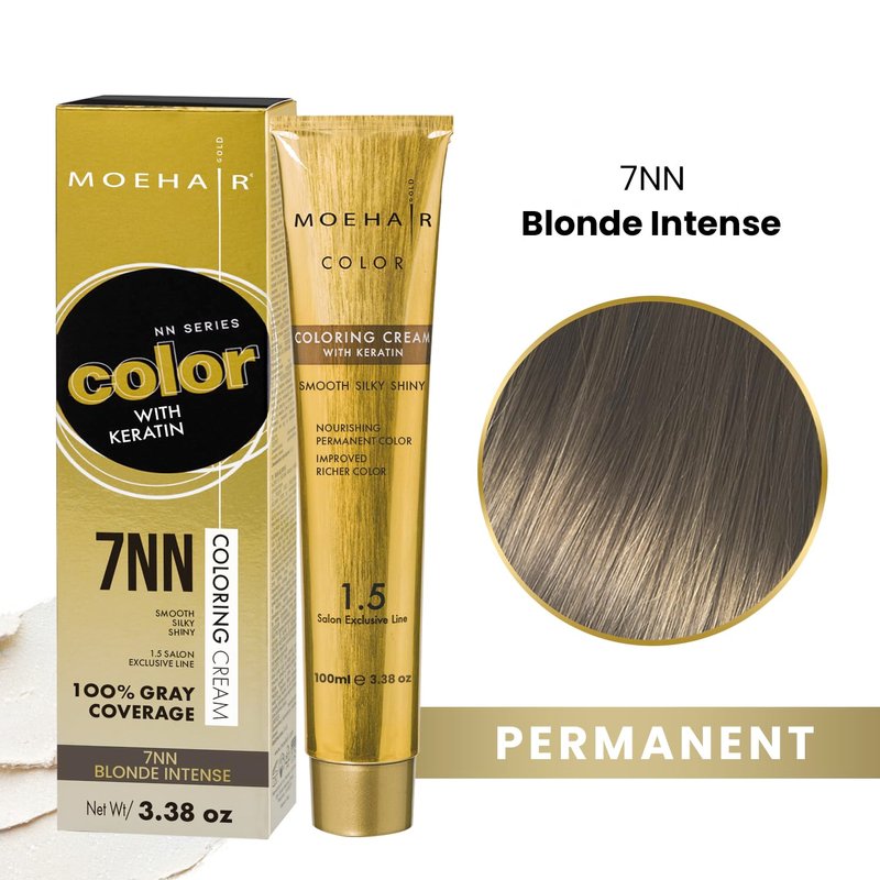 - ✔️ SALON-GRADE PROFESSIONAL COLOR — The salon-grade 7NN hair color is luxuriously crafted for professional, fade-proof coloring. Treat your tresses to long-lasting brilliance with the rich, velvety, and crème color series. Moehair 7NN Blonde Intense salon-exclusive permanent hair dye brings a subtle change and prepares you for a makeover. The non-drippy and easy-to-apply hair dye gives the desired, fade-proof deposit through intense absorption through cuticles.