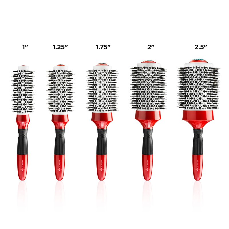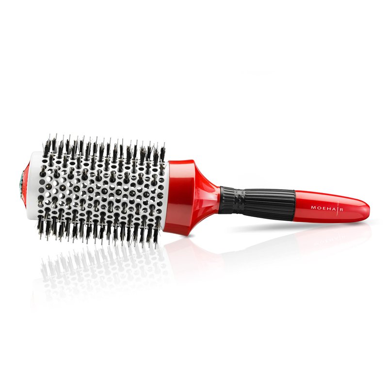 - The brush sizes shown are only based on barrel diameter; to account for bristles diameter, add 1" (inch) to barrel diameter. Each brush top is adorned with the unique Moehair Aqua-Marine Crystal, to set the brush apart from others for easy identification on set or in the salon.