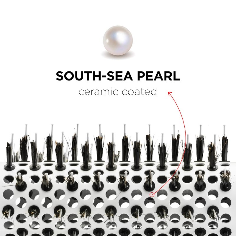 - A stunning paddle shaped design with South-Sea Pearl ceramic-coated silver barrel, black, heat-resistant bristles, an iconic monroe-red handle shaft, travel convenient, and easy-grip handle.