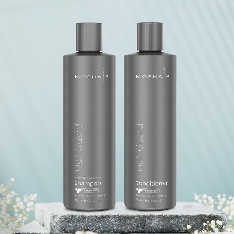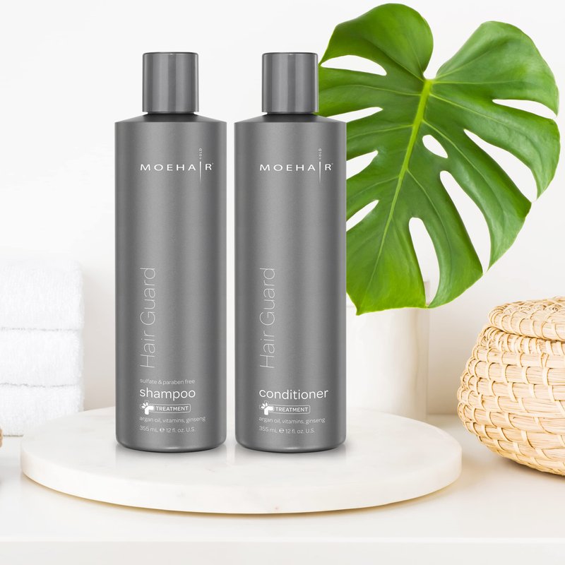 Moehair Hair Guard Shampoo and conditioner is a complete hair fall and hair thinning solution against breakage and hair loss. A sulfate and paraben free hair care system it works as a hair thickening shampoo and conditioner set that deeply strengthens, moisturizes and nourishes hair to prevent dryness, frizz and weakening of hair.