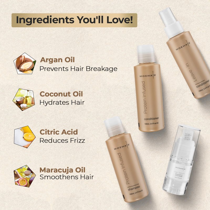 MOEHAIR Travel Kit (Protein Shampoo and Conditioner Set - 3.4 Fl Oz, Leave-In Conditioner - 3.4 Fl Oz & Hair Serum - 0.5 Fl Oz), Travel Friendly I Sulfate & Paraben Free | Suitable for All Hair Types