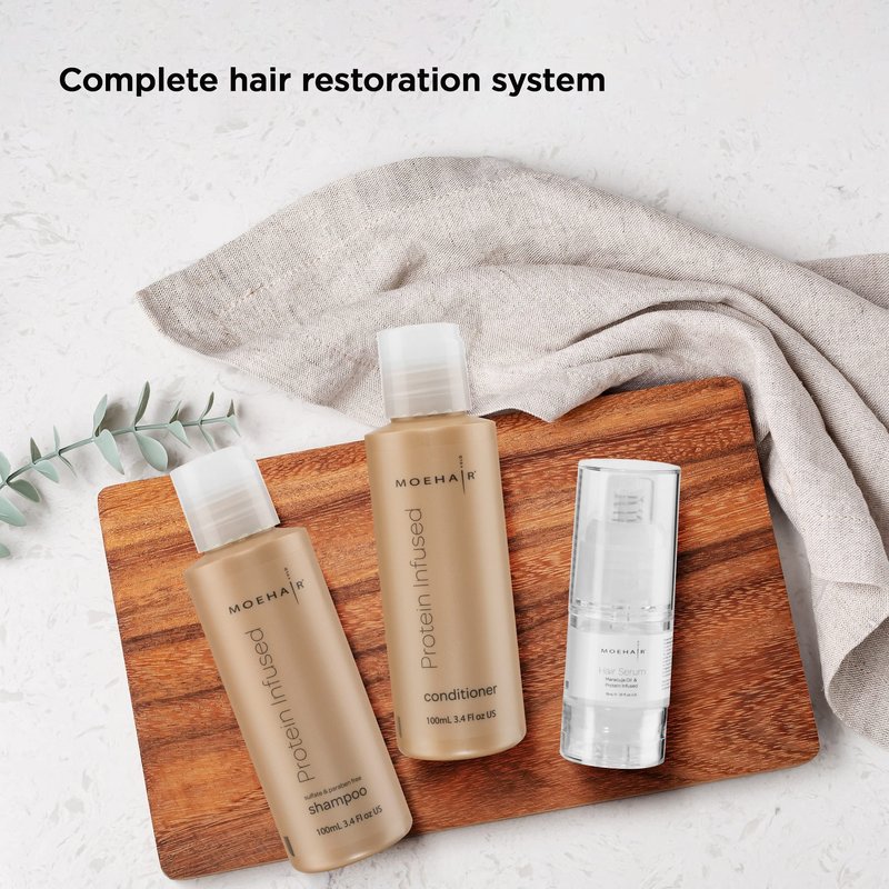 - Travel Friendly: The Moehair Trio Pack of Protein Infused Shampoo, Conditioner and Hair Serum pack is travel friendly packed in hygienic containers