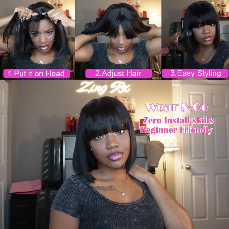 - Bob Wig with Bangs Human Hair: Short Human Hair Wig With Bangs,No Glue Needed,Beginner-Friendly,Easy to Put On and Take Off.Lightweight and Breathable,Allowing You to Go Your Daily Activities with Ease and Confidence