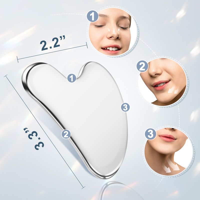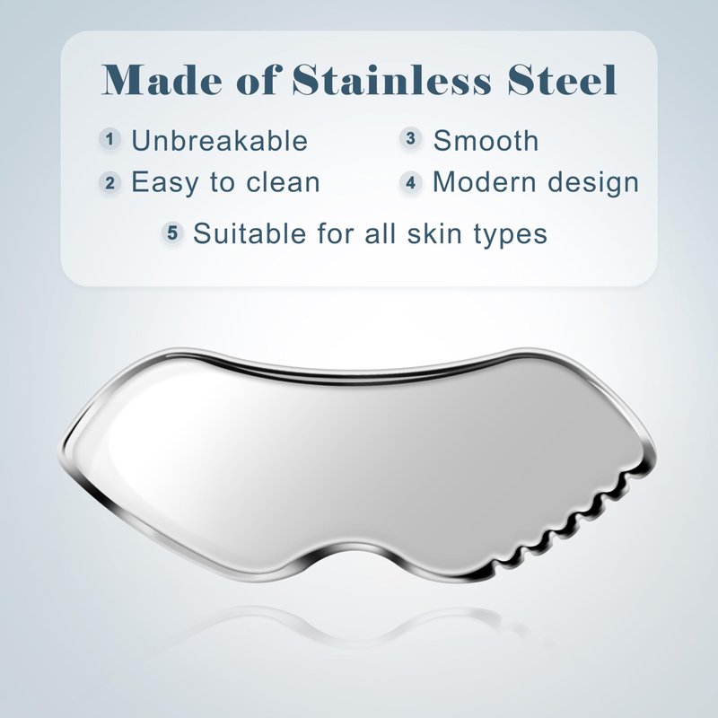 Stainless Steel Durability The stainless steel gua sha tool offers exceptional durability and longevity, outlasting traditional alternatives like jade or rose quartz. It ensures peace of mind, as it won't break if accidentally dropped during use. Versatile Application This metal gua sha isn't limited to just the face; it's suitable for various body parts like arms, back, neck, abdomen, and more. Its flexibility makes it a versatile tool for holistic wellness routines. Ergonomic Design for Comfort Crafted with an ergonomic design, the facial massager tool adapts seamlessly to the body's curves, ensuring a comfortable and effective massage experience. Its smoother surfaces and double bevel edges prevent skin scratches, enhancing safety and user satisfaction. Enhanced Circulation and Muscle Relaxation Utilizing the gua sha facial tools aids in promoting blood circulation and relieving muscle tension. This promotes relaxation, rejuvenating the skin and leaving a radiant, refreshed complexion. Effective Jawline Sculpting The face sculpting tool specifically targets the jawline, helping to define and sculpt it with regular use. This feature is particularly beneficial for those seeking a more contoured facial appearance. Thoughtful Gift Option Packaged in an elegant presentation box, this gua sha set makes an ideal gift choice for loved ones. Its practicality, durability, and aesthetic appeal ensure it's a gift that's both thoughtful and functional.