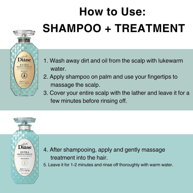 Diane Perfect Beauty Extra Fresh & Hydrate Shampoo nourishes the hair and treats damaged hair due to sunlight exposure. Refreshes the hair and scalp with the citrusy herbal scent!