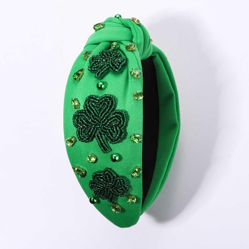 Features wide top knot headband with glitter/beaded shamrock charm accents, and sparkling baroque gemstone embellishments.