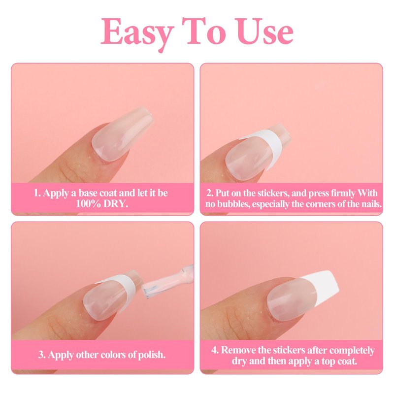 - Easy to Use: Our nail guide tips are self-adhesive, and work great with regular polish and acrylic nails. Stick the nail guide and leave a gap, apply nail polish, and peel off the sticker after it is completely dry, and will not mar or leave some glue mark on your nail after removing, it's very simple to use.