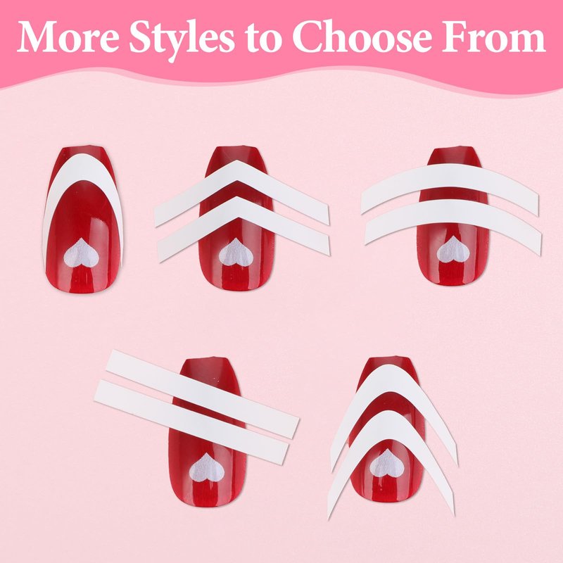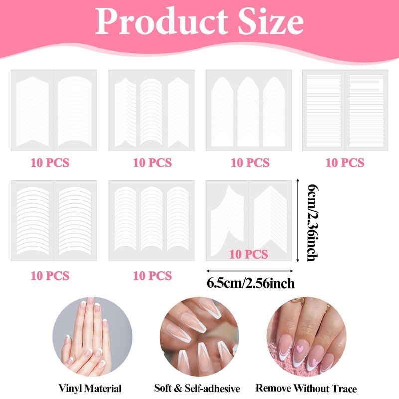 - Package Includes: This French tip sticker comes with 70 sheets with round, V-shaped, wavy, arc moon shapen, and other styles, More than 500 stickers per design, 2780 stickers in total. Our nail guide stickers are suitable for different nail sizes and radians, meet all your needs for nail shapes, and can be used in combination to make your nails more beautiful.