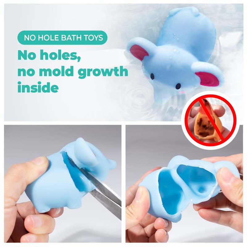 - MOLD FREE BATH TOYS - Hely Cancy no hole bath Toys are sealess that don't trap water inside! So mommy doesn't have to worry about mold anymore! Also, the bathtub toys are easy to clean and dishwasher-safe. Not only use as baby bath toys, but also can play out of the tub!