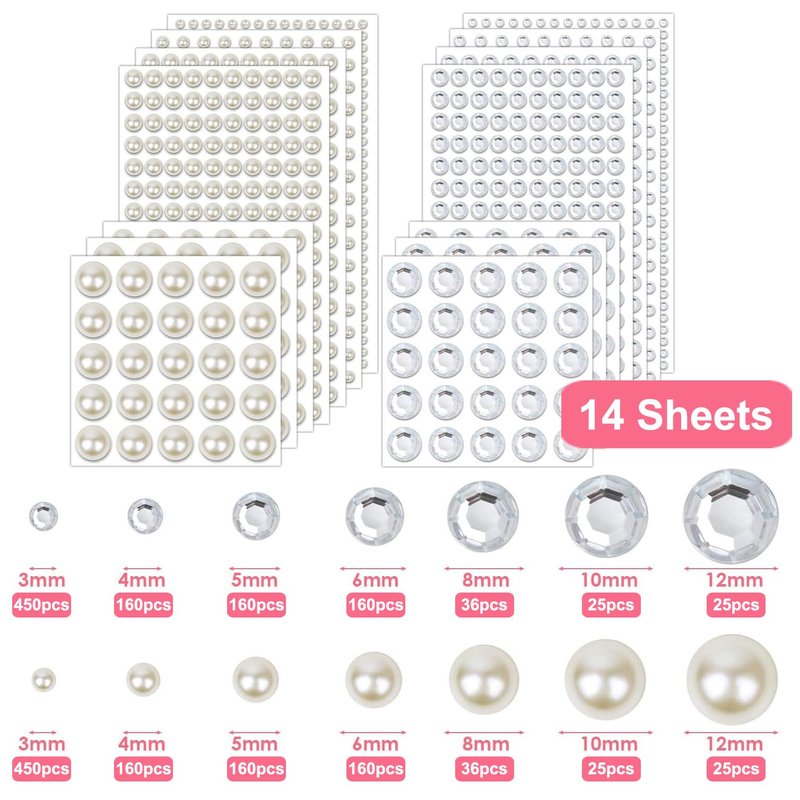 - 【PACKAGE INCLUDE】: You will receive 7 sheets body pearl stickers and 7 sheets rhinestones stickers, face rhinestones in 7 sizes, 450pcs of 3mm, 160pcs of 4mm, 160pcs of 5mm, 160pcs of 6mm, 36pcs of 8mm, 25pcs of 10mm, 25pcs of 12mm, enough quantity and assorted sizes to meet your various makeup and craft projects needs.