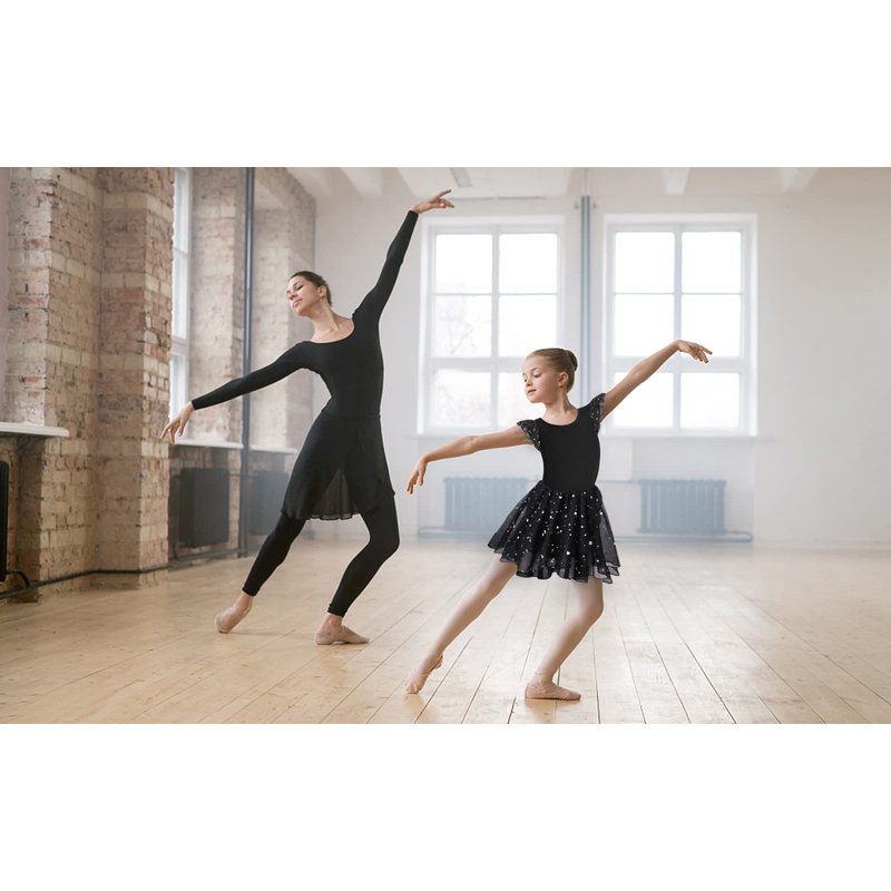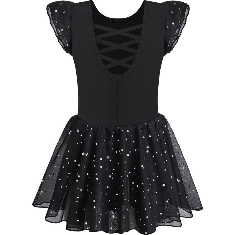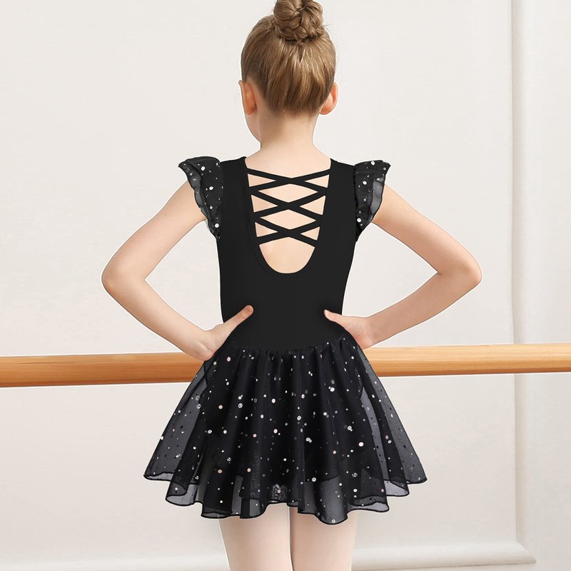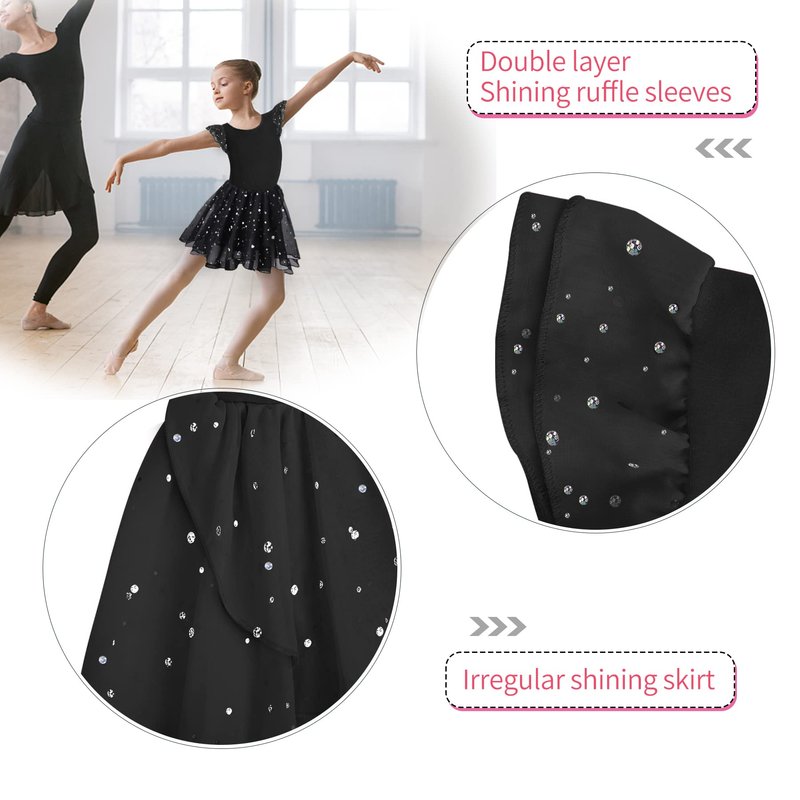 MOLLDAN Girls Dance Leotards for Ballet Dress Shiny Skirt Ruffle Sleeve Crisscross Back(QT4043-06-M) Black