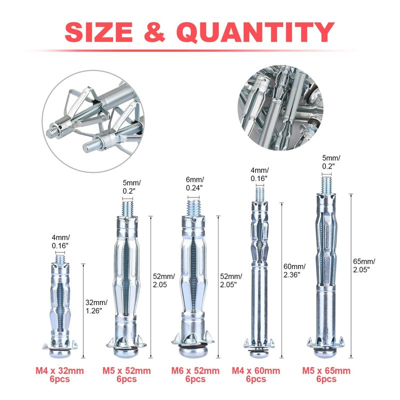 -- Molly Bolt Size: 4x32mm, 4x60mm, 5x52mm, 5x65mm, 6x52mm
