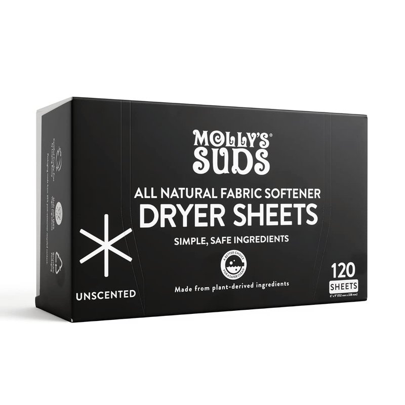 Molly's Suds Fabric Softener Dryer Sheets for Sensitive Skin | Plant-Based Static Reducer, Plastic-Free Packaging | Unscented (120 Sheets)