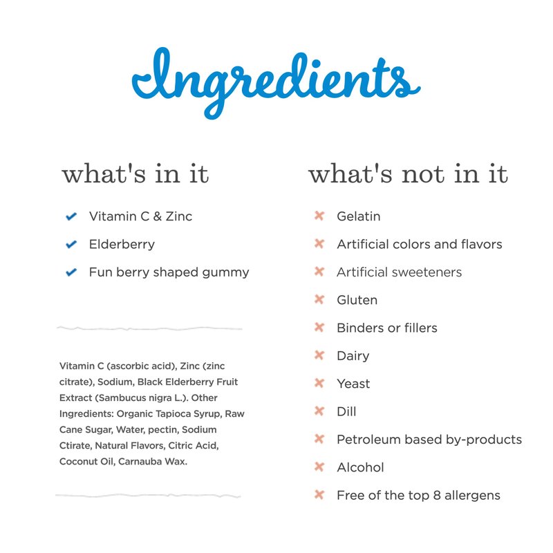 - Antioxidant Rich Trio of Ingredients: Packed with antioxidant-rich elderberry, zinc and vitamin C. Each serving of 2 gummies contains 50 mg of Black Elderberry Fruit Extract which is equivalent to 1.6 grams of Black Elderberry