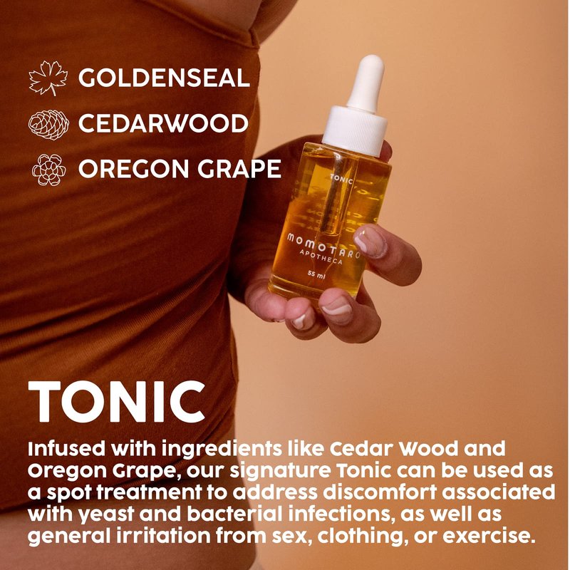 - Infused with ingredients like Cedar Wood and Oregon Grape, our signature Tonic can be used as a spot treatment to address discomfort associated with yeast infections and BV, as well as general irritation from, clothing, exercise, and more.