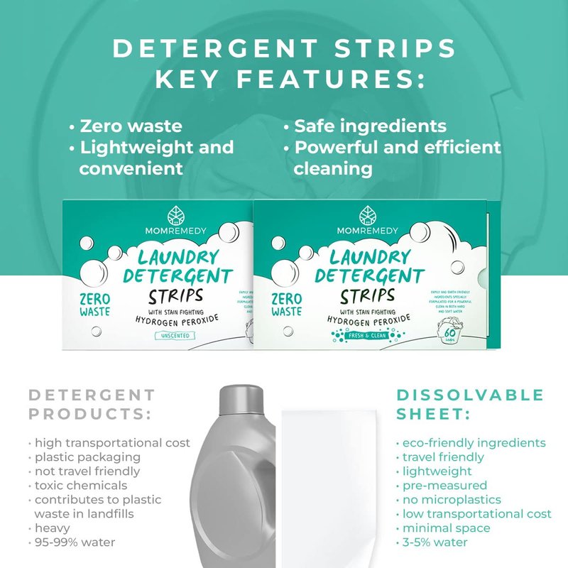 MomRemedy Laundry Detergent strips are easy to use and effective as a laundry detergent. Carefully made, our laundry sheets contain plant based ingredients with added hydrogen peroxide for extra stain fighting power. Our zero waste packaging is better for the environement with no plastic waste and reducing the carbon footprint casued by transporting heavy liquid detergent that is 99% water. Make the switch today and choose the better option for your family and the environment.
