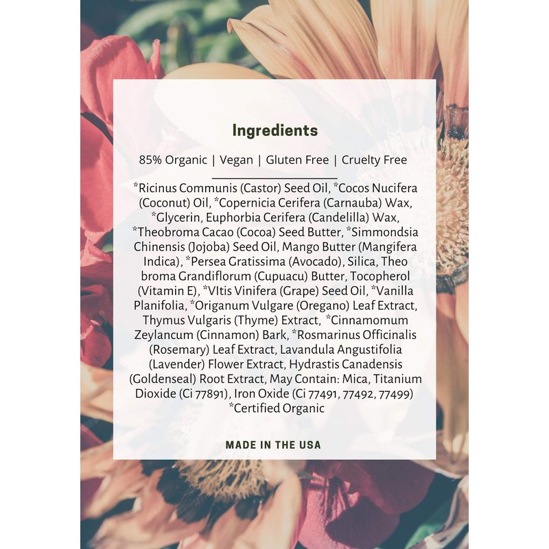 - Antioxidant Rich organically derived Jojoba, Avocado, and Coconut oils help hydrate and Nourish lips.