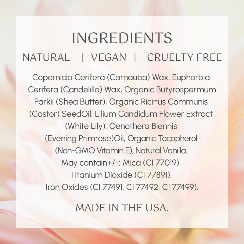 Copernicia Cerifera (Carnauba) Wax, Euphorbia Cerifera (Candelilla) Wax, moisturize and smooth. Organic Ricinus Communis (Castor) Seed Oil, Organic Butyrospermum Parkii (Shea Butter), soothe and nourish. Oenothera Biennis (Evening Primrose) Oil rich in antioxidants it facilitates the healing process, reduces and calms inflammation. Lilium Candidum Flower Extract (White Lily) fortifies, protects, moisturizers and regenerates the skin due to the high level of saponins and polysaccharides. Vitamin E Non-GMO derived from Sunflowers rich in antioxidants.