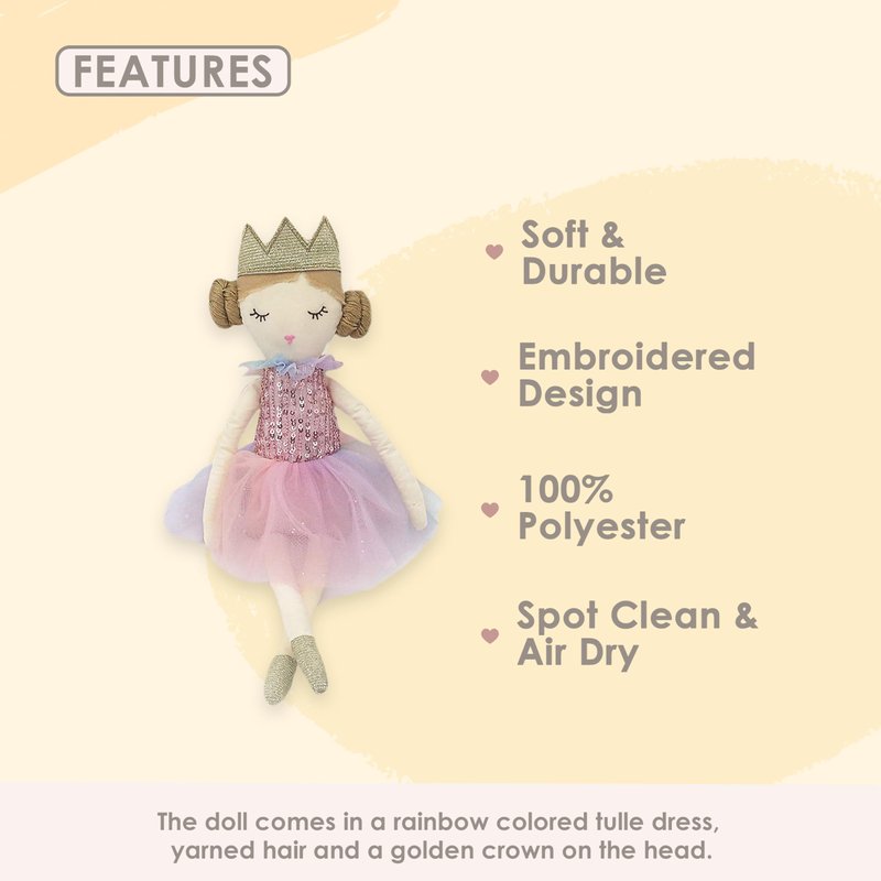 - SOFT PLUSH DOLL – The doll comes in a rainbow colored tulle dress, yarned hair and a golden crown on the head. Give your little girl a doll that she will appreciate so much that she will want to play with it and cuddle it nonstop. The Mon Ami Magali Rainbow Princess Designer Plush Doll makes an excellent toy for infants, toddlers, children, and even young kids. Soft toys promote empathy and foster a sense of belonging and love among young children.