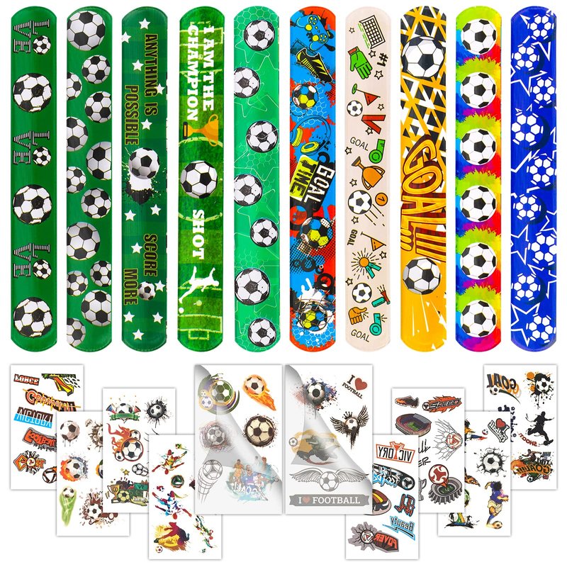- Soccer Set - Package contains 30 soccer slap bracelets, 10 soccer temporary tattoos, both tattoos and slap bracelets have 10 different patterns for you to choose, best choice for birthday gift, soccer party.