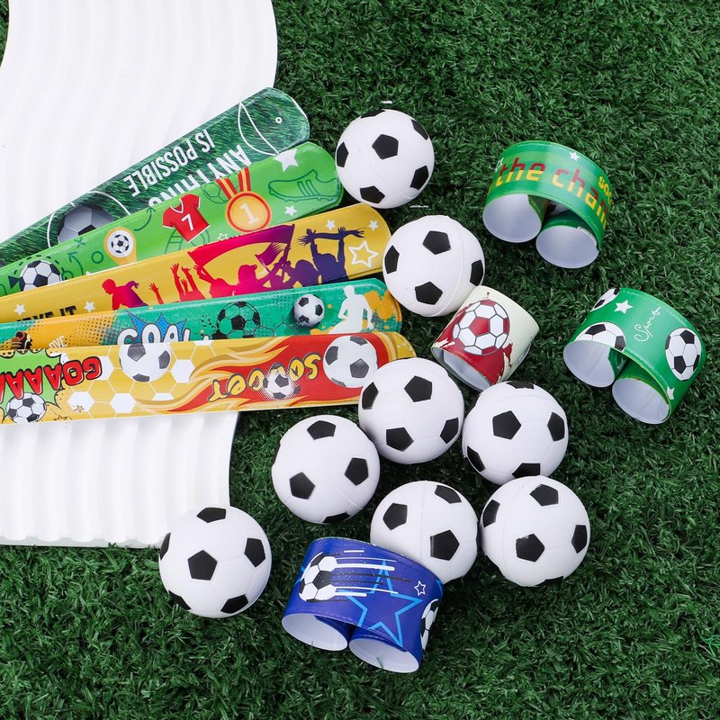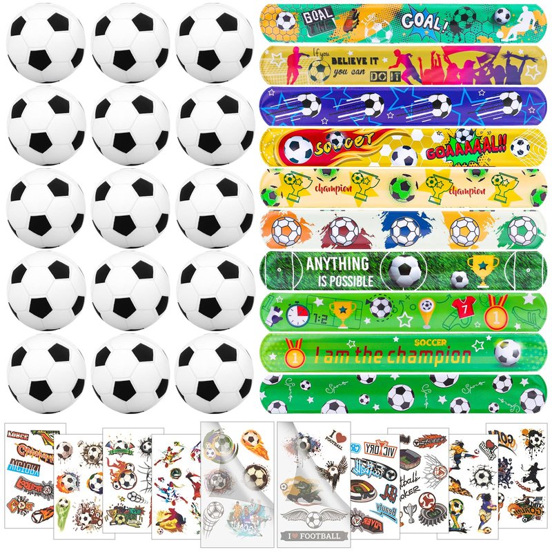 - Package include--- This assorted soccer party favors include 20 soccer slap bracelets, 20mini foam baseballs , 20 soccer temporary tattoo.