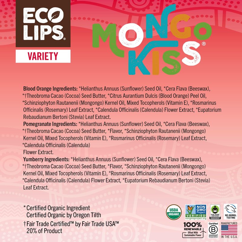 Mongo Kiss Organic Lip Balm 6-Pack by Eco Lips 100% Organic Beeswax & Cocoa Butter Lip Care with Mongongo Oil - Soothe & Moisturize Dry & Cracked Lips - Made in USA. (Pomegranate, Yumberry, Blood Oran