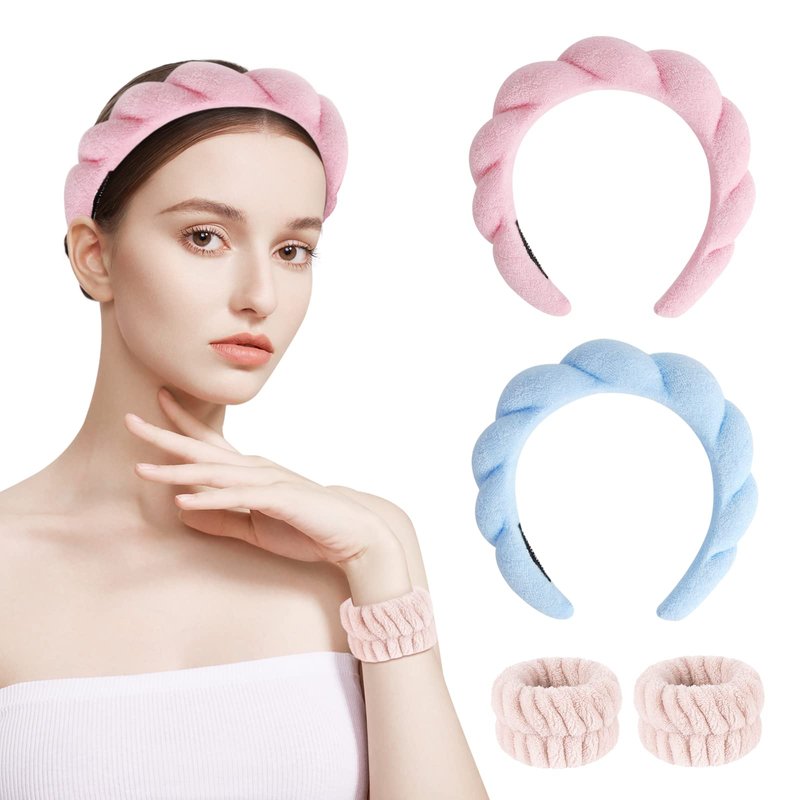 - 🎀【Generic Sizes】Our makeup headband is adjustable loose and tight to fit most people.The spa headband has good flexibility and elasticity,and the head will not feel too tight or too loose when worn, and the head will not feel pain when worn for a long time.No Slip & Comfortable.Package Included:1 x Pink spa headband,1 x blue spa headband,2 x pink wash wristbands.