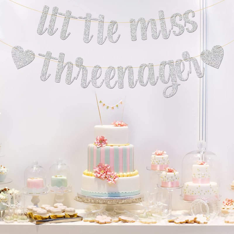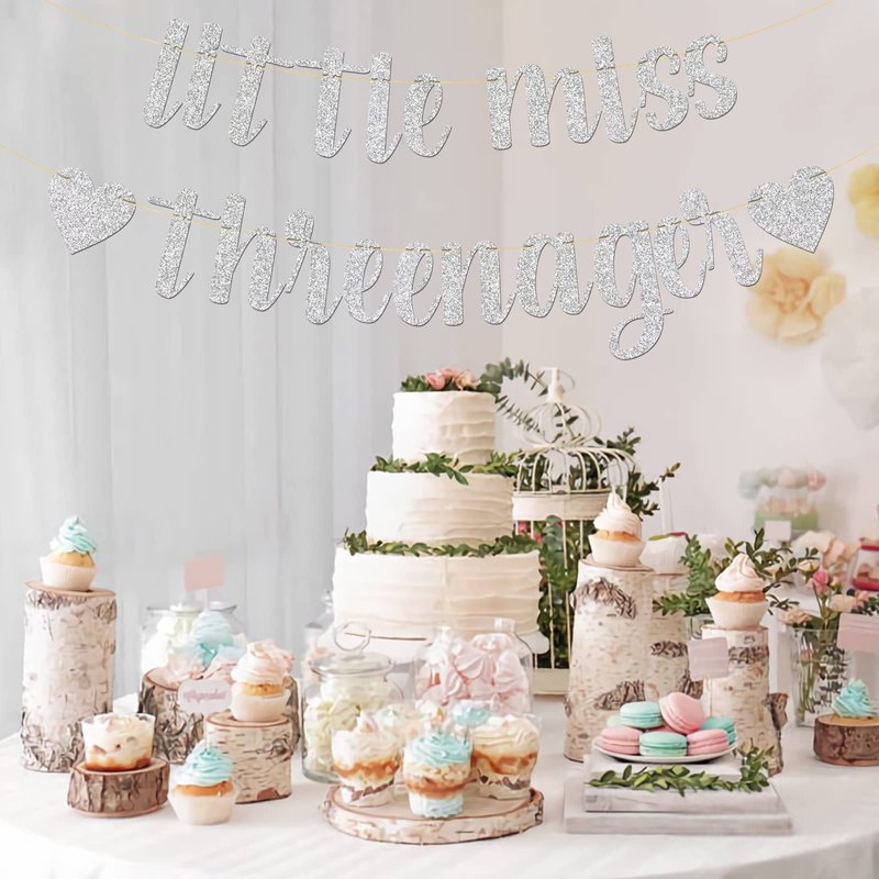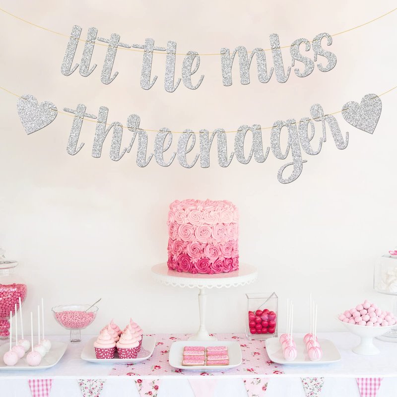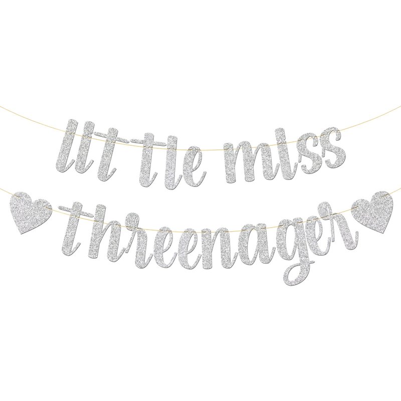 MonMon & Craft Little Miss Threenager Banner/Children Girl 3rd Birthday Party/Hello Three Sign/Little Girl Three Years Old Birthday Party Decorations - Silver Glitter