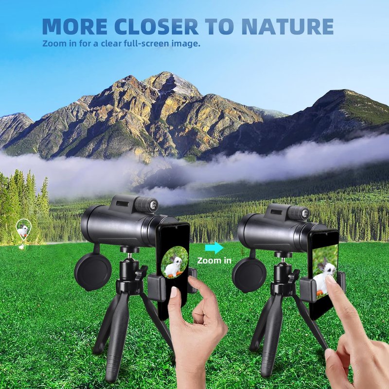 - 【Compact And Easy To Use】:This monocular is compact with all types of smartphones and is very easy to use.Document and share your outdoor escapades effortlessly! With a phone adapter and a tripod,you can take clearer and more beautiful photos outdoors at any time,capture the wonderful moments and share with your friends.