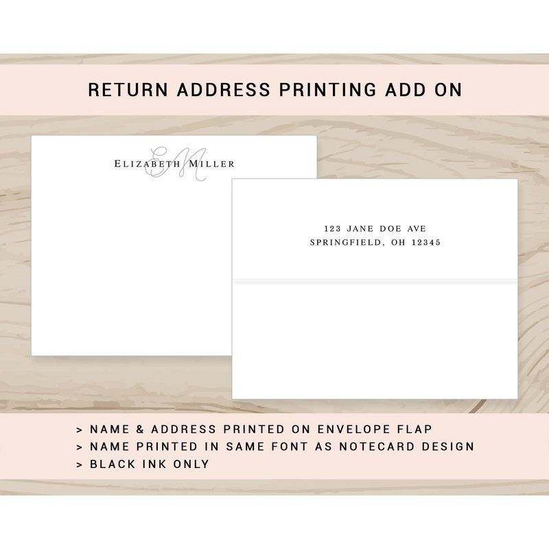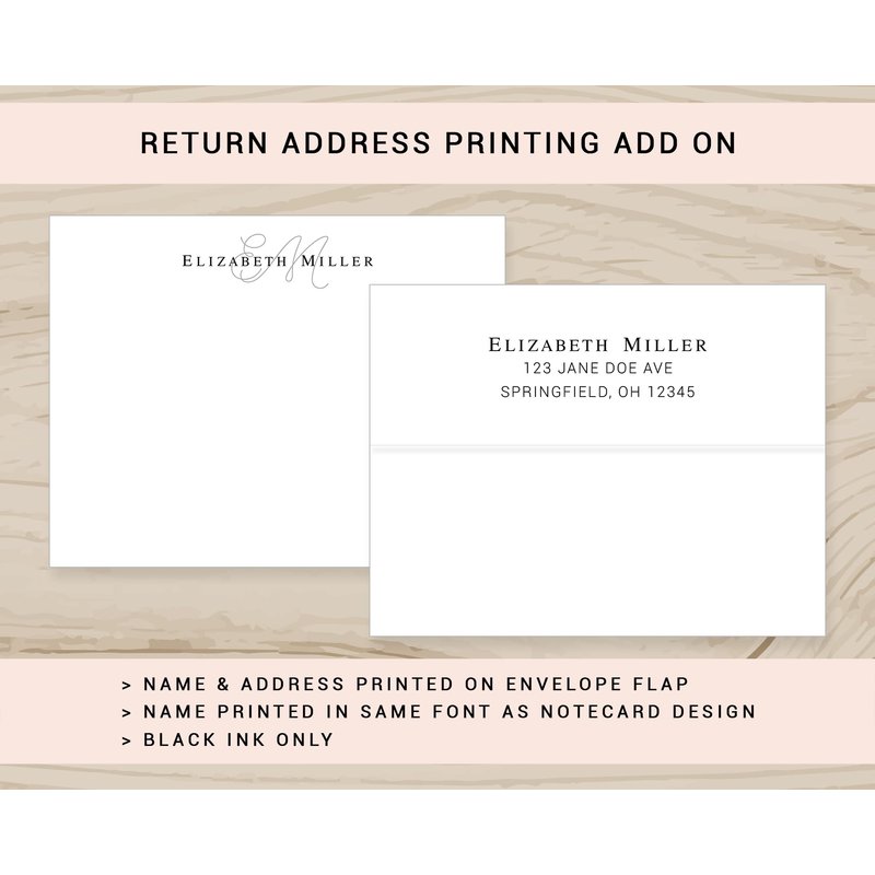 - CUSTOMIZATION - Select the "Customize & Add to Cart" button to enter the name / text you want printed. The name will be printed in the font shown in the pictures. Next, select an envelope color from a list of envelope colors and choose ink color from the dropdown options. The return address printing is an optional add-on. To include this option, enter the name and address to print on the back flap of the envelope.