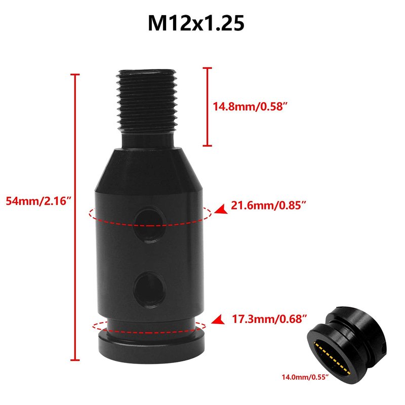 - 【Dimension Description】The shift knob adapter design for 12mmx1.25mm thread pitch . Outer thread diameter 0.47”&thread pitch 0.05".Bottom Inner thread diameter 0.55"/14mm, Plastic hoses diameter 0.31/8mm",0.39/10mm",0.43/11mm,0.47/12mm"