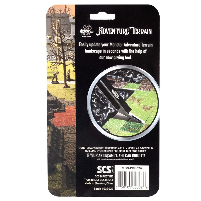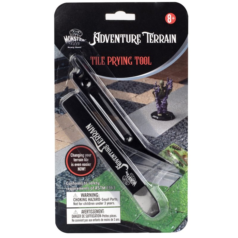 The Monster Adventure Terrain tile prying tool helps players remove their tiles quickly and easily to change 3-D tabletop worlds in minutes. This tool will prove essential in changing terrain and alleviating long delays in play or scenery updates. You will not believe how easy this tool makes swaping out terrain tiles and pieces.