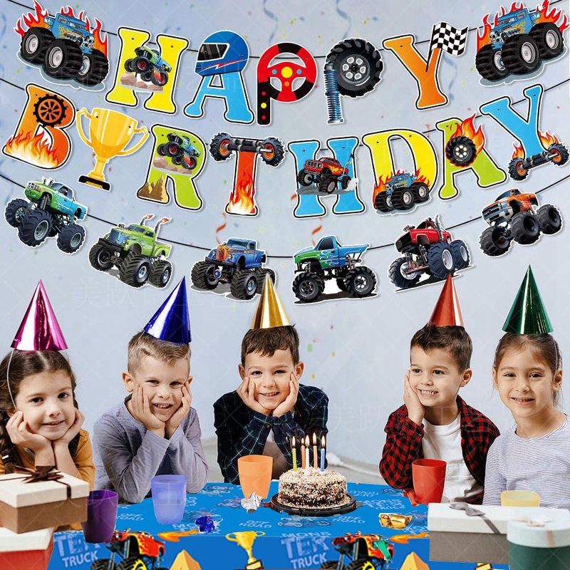 - 【Package Include】1 x Monster Truck happy birthday banners, 1 x Monster Truck banner, 9 x Monster Truck themed hanging swirls, 50 x Monster Truck Stickers, 2Pcs Monster Truck Tableclothes for party decoration.