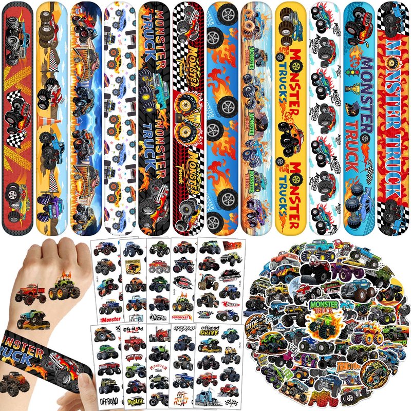 Monster Truck Party Favors 24 Pcs Monster Truck Slap Bracelets 50 Pcs Monster Truck Stickers 80 Pcs Monster Truck Tattoos Monster Truck Birthdays Decorations Supplies for Kids Boys Classroom Rewards
