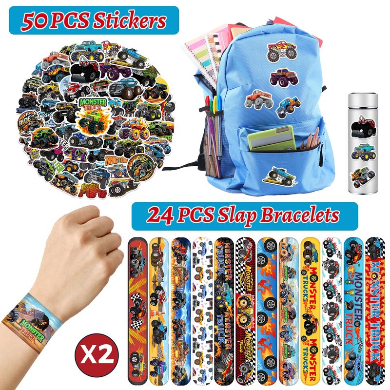 Monster truck party favors include 24 pcs(12 unique styles) monster truck slap bracelets, 50 pcs monster truck stickers, 10 sheet of monster truck tattoos. Enough quantity to meet your party needs!