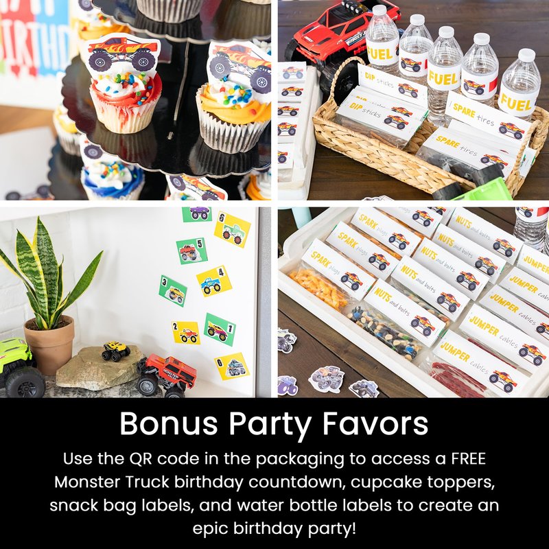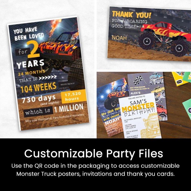 - Bonus Party Favors: Use the included QR code to access free downloadable monster truck decorations for your goodie bag stuffers for kids 3-5. Downloads include customizable monster truck party invitations, thank you cards, snack labels, and a birthday countdown, ensuring you have everything you need to create a memorable monster truck birthday party.