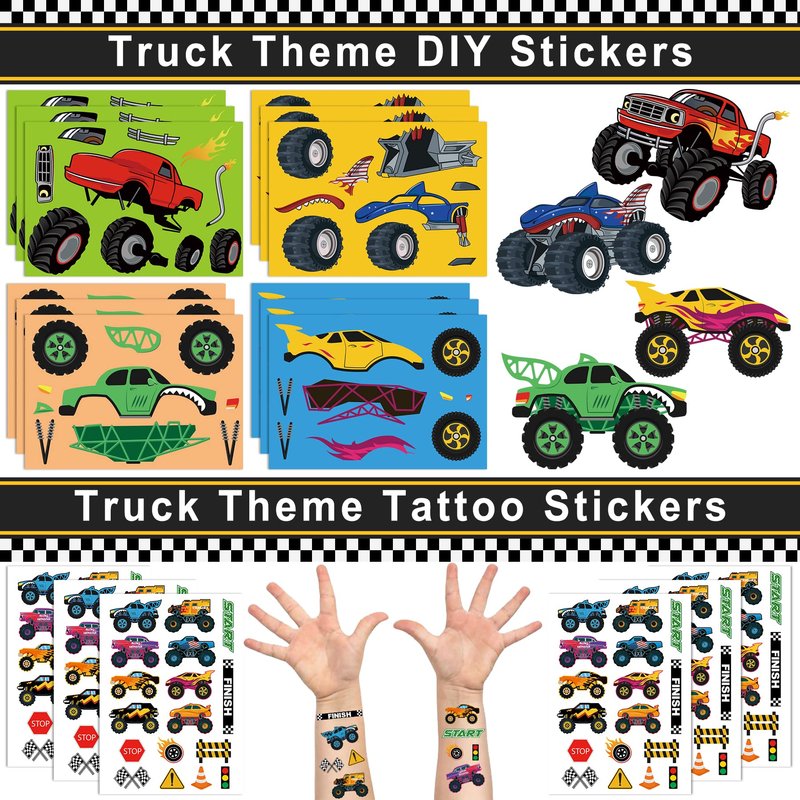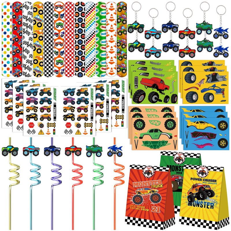 - PACKAGE INCLUDE - Monster Truck Party Favor Set includes 12 PCS Truck Theme Slap Bracelet, 12 PCS Truck Keychains, 12 PCS Tattoo Stickers, 12 PCS DIY Stickers, 12 PCS Truck Straws and 12 PCS Truck Party Gift Bags.