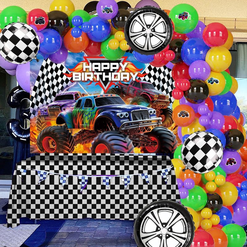 - Monster truck rally party supplies: This 85-piece monster truck themed balloon kit is designed to transform any party space. It includes various balloons in matte deep blue, purple, red, yellow, orange, and green,black,plus unique racecar and checkered flag aluminum balloons for an authentic racing atmosphere.