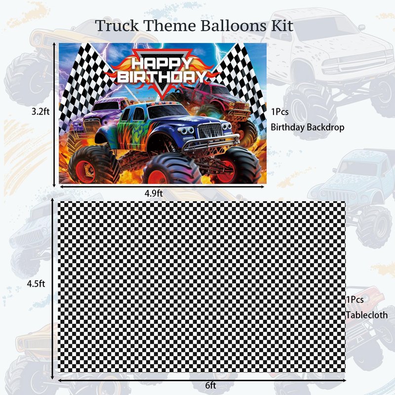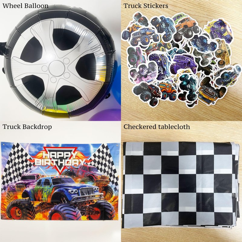- Decorative Accessories: Enhance your party setup with our high-quality monster truck birthday backdrop and a durable 1.8m checkered tablecloth, perfect for adding a thematic touch to your celebration. Also included are 50 vibrant truck-shaped stickers to delight your little guests.