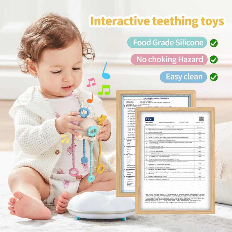 - 【Boost Baby's Development】This montessori toy is designed to enhance baby's development. Offering various engaging play options like pulling up and down, pressing, rattling, and chewing, this versatile toy can stimulate baby’s motor skills, hand-eye coordination, and sensory exploration. The silicone material is perfect for teething infants and toddlers, while the bright colors and sounds incorporated into the toy effectively promote visual and auditory development.
