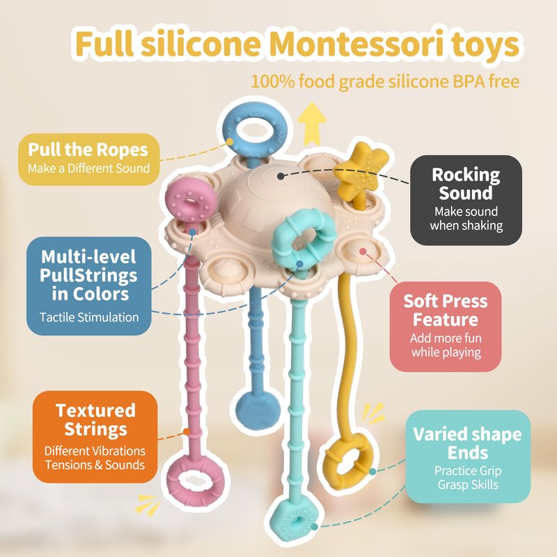 Montesorri-Toys - Montessori Pull String Toy - Made of 100% Food Grade Silicone with Built-in Rattle Function and Easy to Clean Design (Cream Color)
