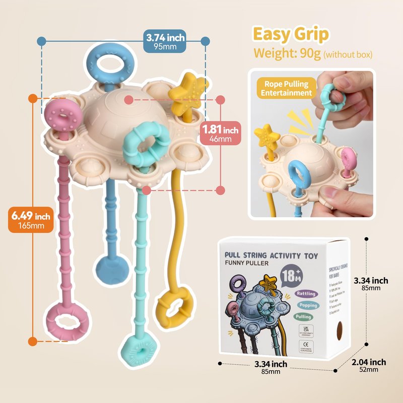 - 【Funny Sensory Development】With 4 different textures, colors, and shapes of ropes, our pull string toys for baby offer a stimulating sensory experience. By pulling the strings, babies will be captivated by the diverse range of sounds and vibrations produced. Each rope requires varying strength to pull, providing a fun and rewarding challenge for babies while promoting their motor skills and hand muscles. Our baby pull toy also feature a soft press to add an extra layer of sensory fun.
